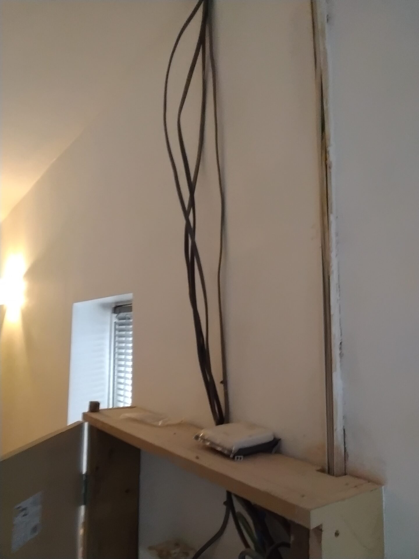 Electrical cables left hanging, shoud be chase in the wall or fitted inelectrical ducting