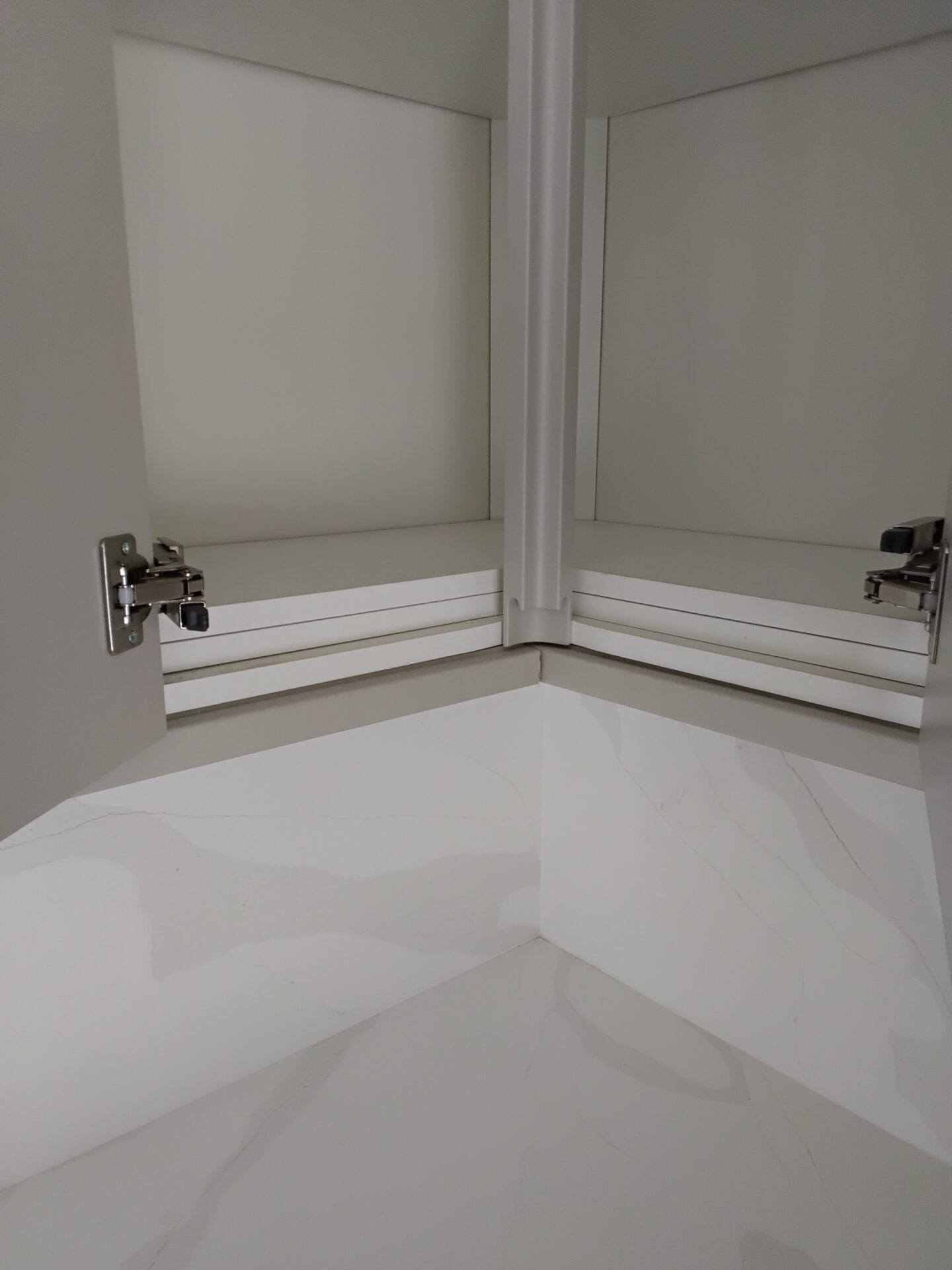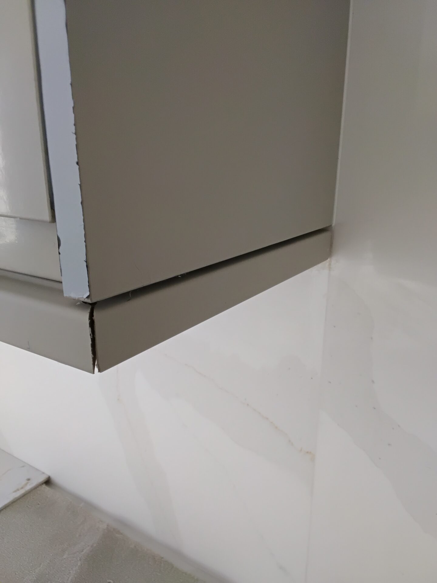 Eaves doors, edges poorly finished, paint on hinges, hinges loose and no stop on the bottom
