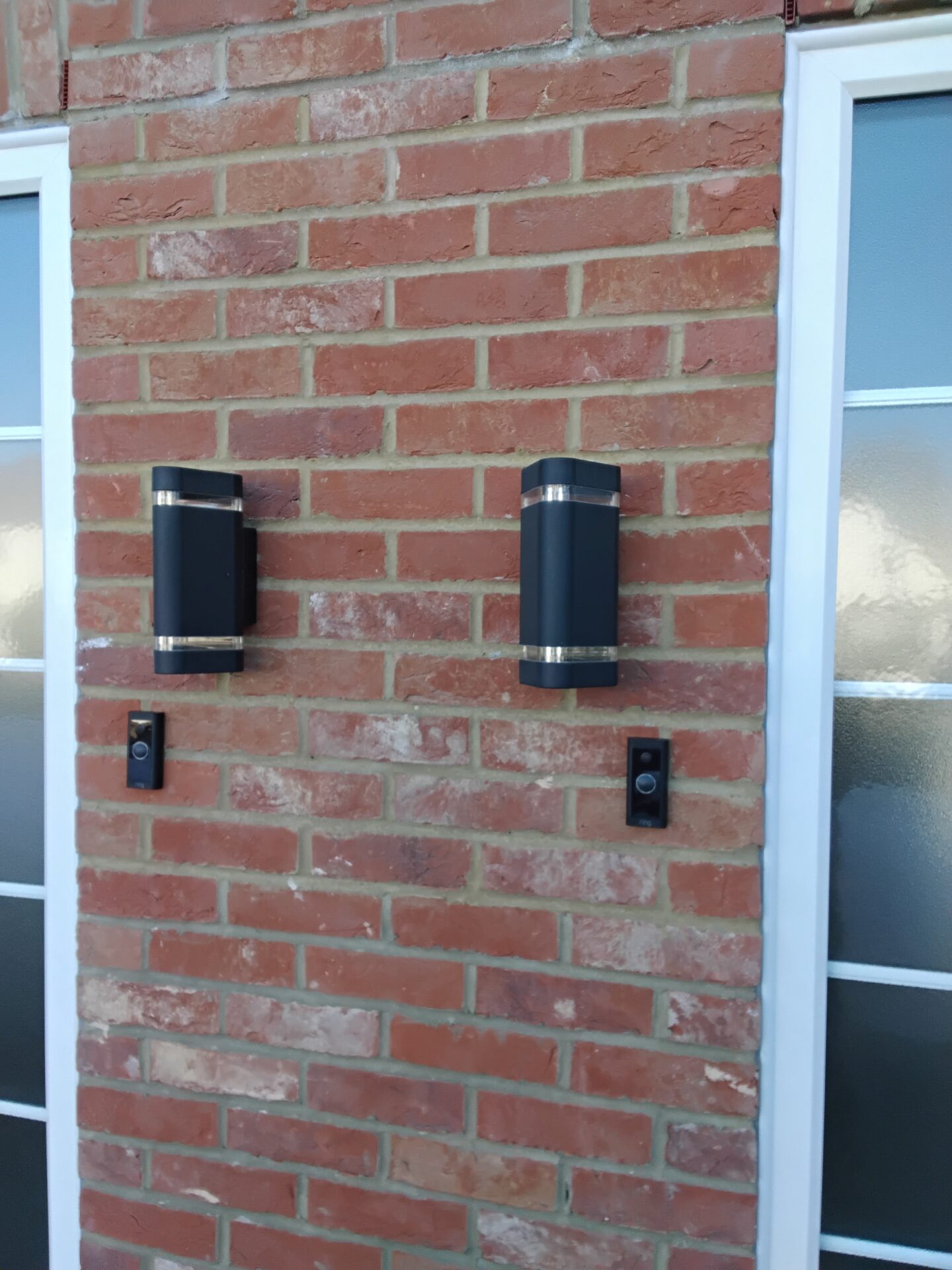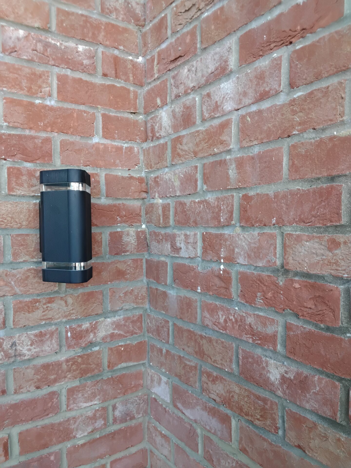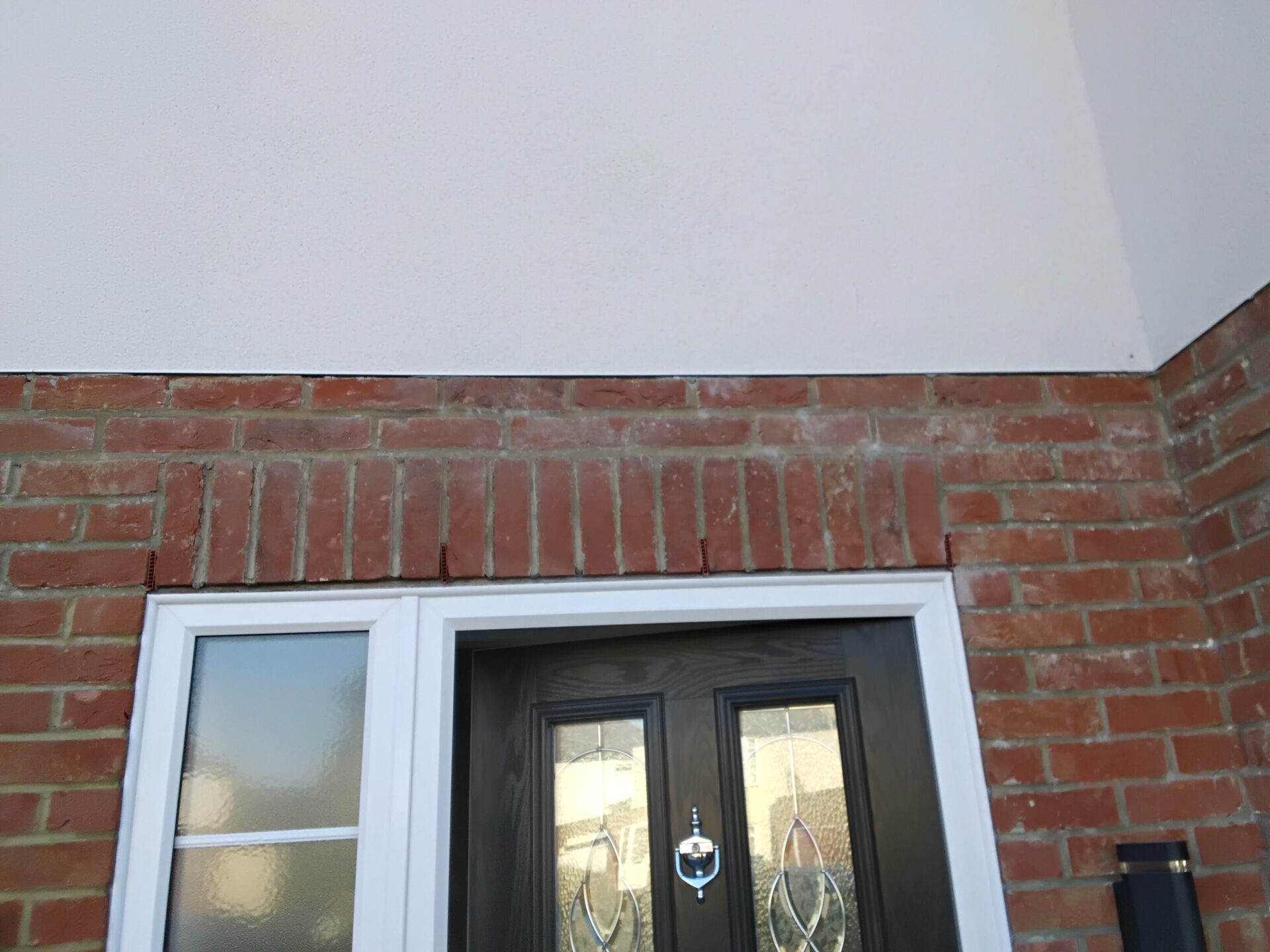 Mortar colour variation on brickwork between the two doors